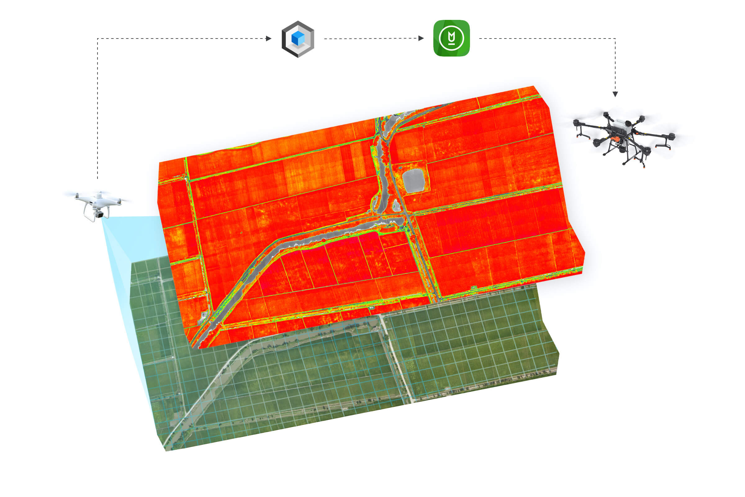 精准农业解决方案可针对作业区域内作物长势差异,进行差异化施用量作业。使用精灵 4 多光谱版对农田进行多光谱图像采集后,配合大疆智图可对农田生成多光谱图像。农田处方图经后续处理生成后,由大疆农业服务平台分发,T20 将根据处方图指引进行精准的肥料播撒或药液喷洒作业。[4]